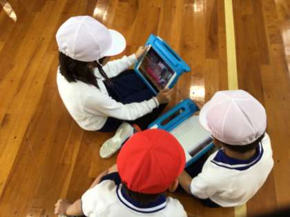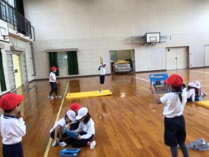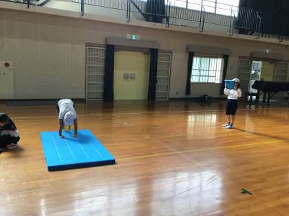 1、2年 体育「マット運動」 公開日 2023/11/09 更新日 2023/11/09 各学年から 1、2年生の体育では、「きれいな前転・後転」も目指して、全員一生懸命に取り組んでいます。学習用タブレットで自分達の動画を録り、お手本の動画と比べることで、きれいな前転を目指しています。