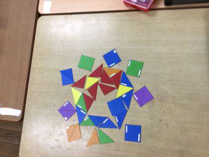 1年生 算数科 かたちづくり 公開日 2023/11/10 更新日 2023/11/10 各学年から 「かたちづくり」の単元に入りました。三角形の色板を使い、1人でいろいろな形を作りました。その後、グループに分かれ、「遊園地」というテーマで協力して形作りをしました。振り返りでは「使ったのは、三角形の色板だけだったけれど、いろいろな形ができることが分かりました」「みんなで協力したら、1人で作るよりもおもしろい形を作ることができました」などという感想が出ました。