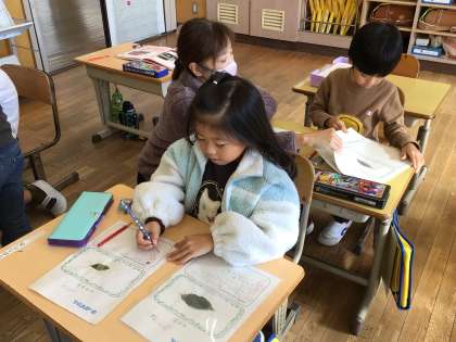 豊田市自然観察の森で特別に採取させていただいた4枚の葉の観察をしました。アサガオの観察で使った技を思い出して、じっくりと観て、ワークシートに書き込みました。