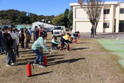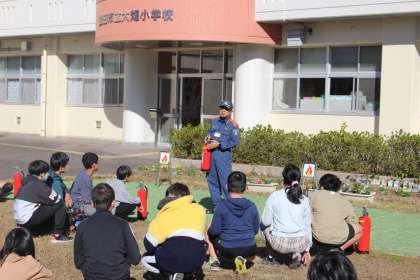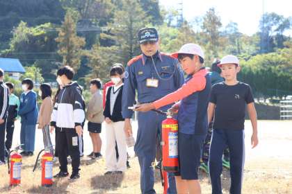 5、6年生は、避難訓練後の体験活動で、「水消火器体験」を行いました。訓練用の水消化器を使い、消防署員の方の笛の合図で、「火事だ!」と言ってから、的を狙って消火活動を行いました。消防署員の方からは、「消火器には普通火災用、油火災用、電気火災用がある、本物の消火器は粉状なので風上から使う、消火器を使うときは後ろに逃げ道を確保してから使う」などの大切なことも教えていただきました。