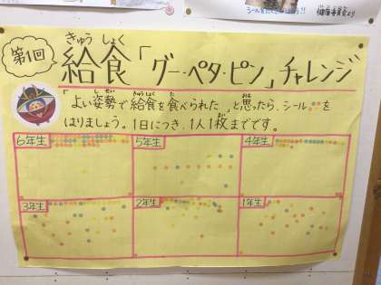 今日は、14日から行なっている「給食グー・ペタ・ピンチャレンジ」の最終日でした。この期間、昼放課になると、よい姿勢で食べられた人が、昇降口にあるチェック表へシールを貼りに来ていました。
