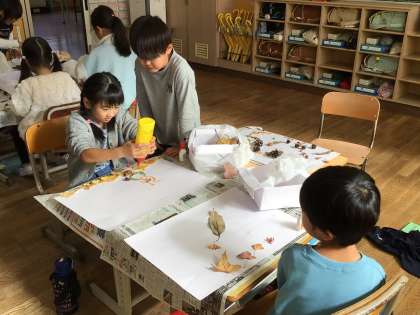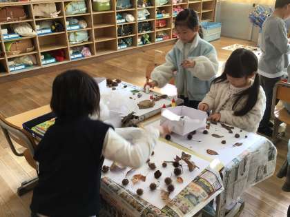 これまで宝箱にためてきた葉っぱや木の実を使って、作品づくりをしました。子どもたちと一緒に考えためあては「はっぱや木のみをつかって、生きものをつくろう」でした。自然からもらった宝物が、画用紙の上でまた別の生き物として生まれ変わりました。葉っぱや木の実を分けあったり、木工用ボンドを譲り合って順番に使ったり、友達と協力する姿もとても素敵でした。