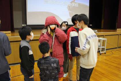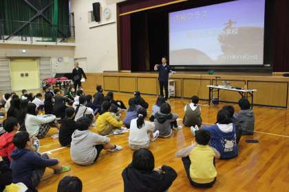 教育支援プログラム「南極クラス」を実施しました。第61次南極地域観測隊 越冬隊の鈴木さんに講師としてお越しいただき、南極での活動を教えていただきました。基地での生活の様子やブリザードの恐ろしさ、南極の自然や動物、オーロラや星空の美しさなど、子どもたちにとって"未知の世界"である南極のお話は、どれも興味深いものでした。鈴木さんの軽快な語りに、子どもたちは、目を輝かせ、話に聞き入っていました。途中、観測隊員の防寒着の試着体験や南極のブリザードの風速60メートルをブロアを使って体験するなど、子どもたちが体感できる活動もあり、大いに盛り上がりました。