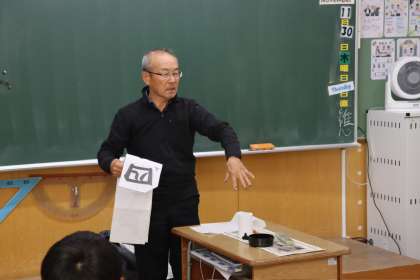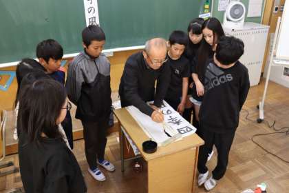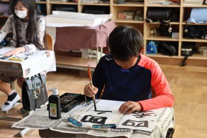書写ボランティアの講師さんに、書き初めの指導をしていただきました。5年生では「四季の風」という文字を書きます。文字によって、力強く書くところと少し緩めて書くところの差を、実際に子ども達の目の前で書いて教えていただきました。また、「止め」「はね」「はらい」の大切さを丁寧に指導していただきました。子ども達も、一画一画に集中して真剣に取り組む姿が見られました。今回指導いただいたことを、本番に生かしていこうと意欲を高めました。
