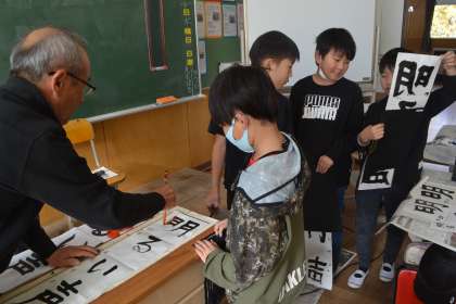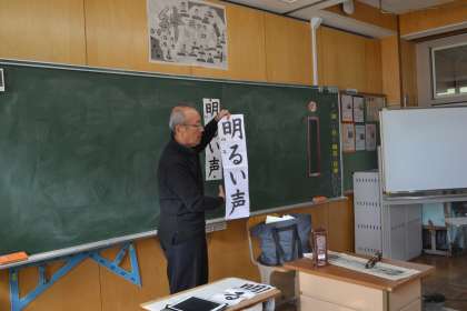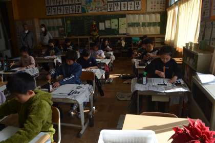 書き初めに向けて練習が始まっています。この日は、地域の書道の先生を講師にお迎えしてご指導を受けました。4年生の今年のお手本は、昨年度と少し変わり「明るい声」です。4文字それぞれの書き方のこつを教えていただいた後、実際に子どもたちが書いたものにアドバイスをいただきました。次回のご指導は2週間後、それまでに今回教えていただいたことを生かし、レベルアップを図りたいと思います。