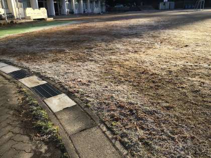 運動場に霜が降りていました