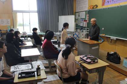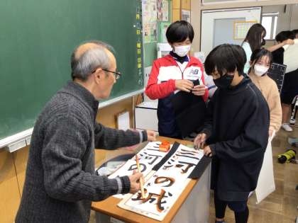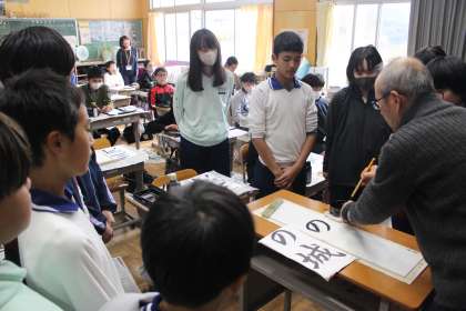 前回の指導していただいた様子から、ひらがなの「の」の筆使いを中心に教えていただきました。個別に、とめやはねのコツを教えていただくだけでなく、「ここが上手になったよ」と、励ましの言葉をいただきました。その言葉は子どもたちにとって、自信となったようでした。授業の最後には、お礼のメッセージカードとともに、感謝の言葉を代表の児童が伝えました。大畑っ子にとって学びの多い時間となりました。