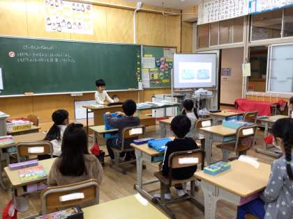 先日、スカイメニューのシンプルプレゼンを使って作成した計算の紙芝居をクラスで発表しました。話し手も聞き手もそれぞれにめあてをもち、発表会に臨みました。振り返りでは、「動物や物など、色々なものが出てきて、おもしろいと思いました」「計算で紙芝居を作るのは、難しかったけれど、楽しかったです」などの感想が出ました。