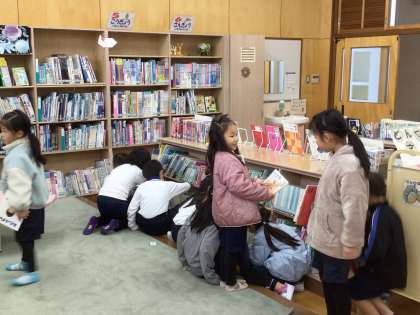 ふだんは、図書室で借りられる本は1日1冊と決まっていますが、冬休み前は、特別に2冊借りることができます。学校図書館司書さんが用意した「あたらしい本」を見て、「わあ!おもしろそうな本だなあ」と嬉しそうに眺め、借りていました。冬休みにもたくさん本を読めるといいですね。
