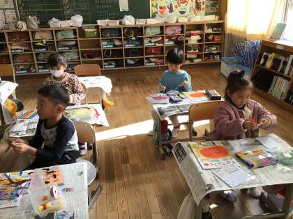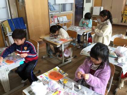 「すきまのすきなすきまちゃん」で、教室内のあらゆる隙間に入る「すきまちゃん」を作りました。すきまちゃんの表と裏で絵が違っていたり、モールの手がにょきっと出ていたり、来年の干支の龍を作っていたり、とても楽しい「すきまちゃん」がたくさんできました。授業の最後にすきまちゃん宝探しをしました。