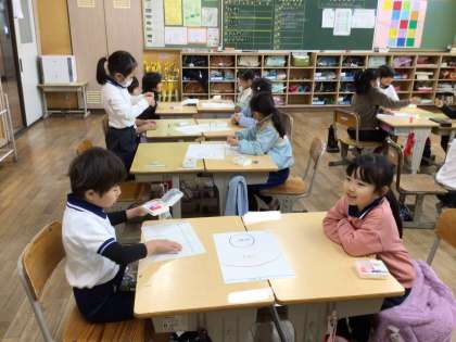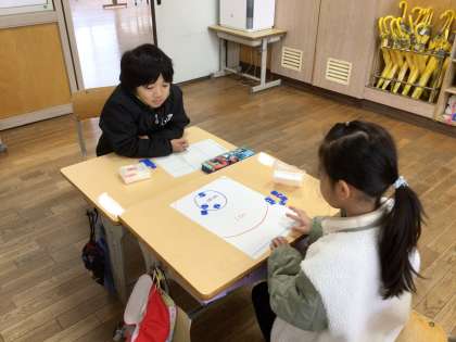 おはじきを使って、点取りゲームをしました。ゲームを通して、数の数え方や数の大小を学びました。