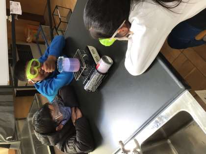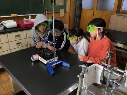 安全のため「ほごめがね」をつけての実験です。水のあたたまり方について、サーモテープやサーモインクを使って調べました。「金属と同じあたたまり方をする」という予想をしている人が多かったですが、結果は少し違いました。