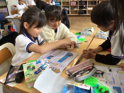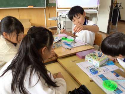 理科の授業では、磁石の力について学んでいます。身近な物で磁石が引っ付く物は何があるか調べたり、間にダンボールを挟んでも、クリップが引っ付くのか調べたりしました。