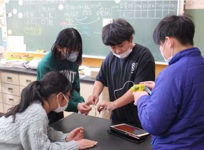 理科の授業で、豆電球とLEDの消費電力の違いについて学んでいます。実際にコンデンサーを使って調べるとLEDが、10分以上長持ちするという結果がでました。