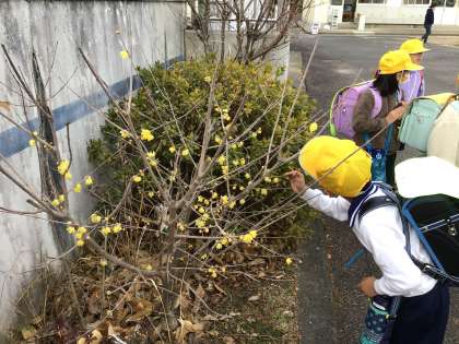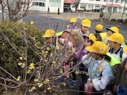 下校時に、いつもより少し早く教室を出て、プール横のロウバイの花を見にいきました。美しい黄色の花からは、とても芳しい香りが漂っていて、鼻を近づけた1年生は「わあ、いい匂い」「かいでみて、いい香りだよ」「また見にこようっと」「金木犀みたいだね」ととても嬉しそうにしていました。