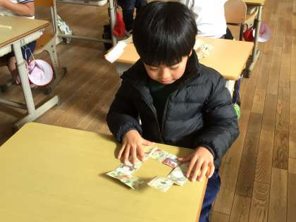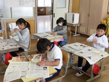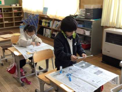 1年生 国語科 むかしばなしパズル 公開日 2024/02/02 更新日 2024/02/02 各学年から 学校図書館司書さんが、1年生教室にむかしばなしの本を揃えてくださったおかげで、1年生はたくさんの昔話に親しむことができました。むかしばなしのパズルを作り、絵合わせにチャレンジしました。ハサミをうまく使い、用紙を半分に折って、のりで貼り付けました。そして、折り筋をつけてパズルの完成です。絵を合わせるのはなかなか難しく、全面揃うまでにはもう少し時間がかかりそうです。