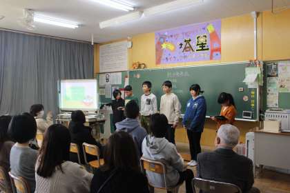 6年生は、4時間目に総合的な学習の時間の発表を行いました。保護者の皆さんに、学校マスコットキャラクター【ばたっぴぃ】をどのように広げていくかを考えて、今年度における実践を発表しました。動画を使って紹介したり、スライドを使って説明したり、歌にして「ばたっぴぃ」の特徴を伝えたりと自分たちなりに考えた方法で発表することができました。地域の方からの広見城址のお話していただいたり、「ばたっぴぃおみくじ」を引いて喜んでいただいたりしている様子を見ることができました。温かく見守ってくださる人がいるありがたさを子どもたちも、きっと感じたことでしょう。参加していただきありがとうございました。