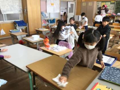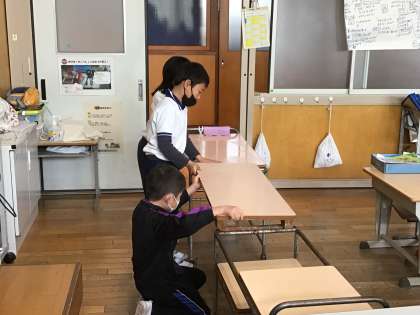 給食の配膳に始めは30分以上かかっていましたが、随分速くできるようになりました。声をかけ合って、協力してるからです。4時間目の授業が終わると、すぐに給食の準備に取りかかります。自分に与えられた役割以外でも、気付いて動く子がたくさんいます。協力して頑張っている1年生は、給食の準備、片付けでも大きく成長しています。