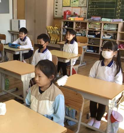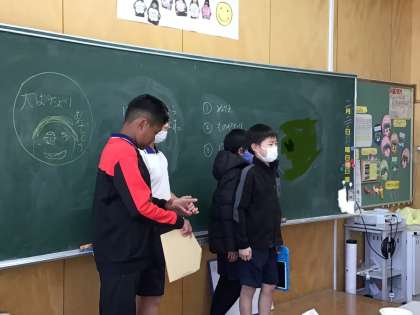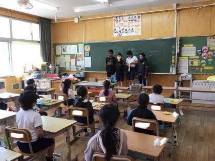 給食の終わりに、4年生が1年生教室へ来て、掲示物作りのことについて説明をしてくれました。用意してくれた用紙に1年生が何を描けばいいのかをゆっくり丁寧に、見本を黒板に描きながら、説明していました。これから他学年の前に出る機会が多くなる4年生、とても頑張っていました。1年生は、4年生の話をよく聞いて、疑問に思ったことを挙手して尋ねていました。