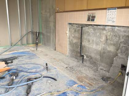 今日は業者さんが、シャワー室設置に向け、タイルや床をドリルで削る作業をしてくださいました。