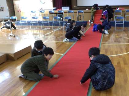 4、5年生で、「卒業式」の準備を行いました。飾り付けはもちろん、長机や椅子を並べたり、演台を設置したりなどしました。みんな、てきぱきと動き、安全に準備することができました。また、6年生が気持ちよく卒業してもらえるようにと、赤絨毯をきれいにしました。