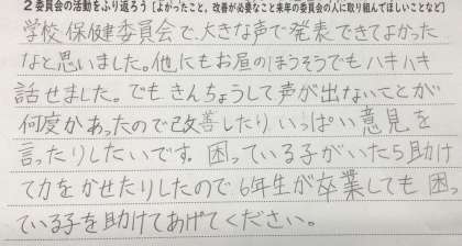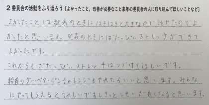 今年度最後の健康委員会 公開日 2024/03/11 更新日 2024/03/11 各学年から 今年度、最後の委員会が行われました。 健康委員会は、はじめに今年度の振り返りをしました。 お昼の放送や学校保健委員会、給食グー・ペタ・ピンチャレンジなどで、自分や友達が頑張っていたことについて振り返りができました。 最後に、6年生から1人ずつメッセージをもらい、「心のバトン」を受け継ぎました。 4、5年生はバトンをしっかり握って、来年度の委員会活動に引き継いでいきたいですね。