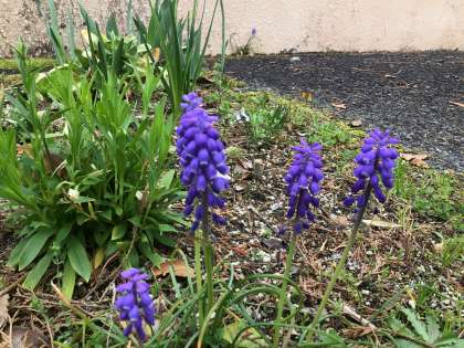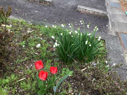 春になり、学校のいたるところで花が咲き始めています。正門の近くには、ムスカリ(花言葉:明るい未来など)やスノーフレーク(花言葉:慈愛、純粋など)、チューリップ(花言葉:博愛、思いやりなど)といった花が咲いています。新学期のスタートに彩りを加えてくれています。