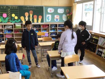 第一回通学班会を行いました。今回は、危険箇所の確認をし、今年度のめあてについて話し合いました。司会をした上級生は、低学年の子たちも読めるように、黒板の書き方を工夫したり、しっかり考えられるように、話し合う時間を取ったりしていました。通学班会の中で、並び順も確認しました。今年度も、大畑っ子みんなで安全に登下校していきます。