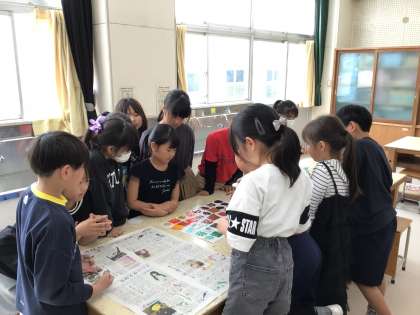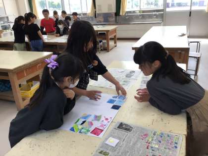4年生 図画工作科「色合いひびきあい」の学習をしました 公開日 2024/04/18 更新日 2024/04/18 各学年から パレットの代わりに小さな紙を使って、絵の具を指で混ぜました。グループで紙を並べて、「わぁ!きれい」「富士山みたいに見える」「これ、どの色を使ったの?」と交流をしました。色のかわり方や友達の作品のよいところをたくさん見つけることができました。