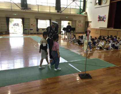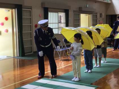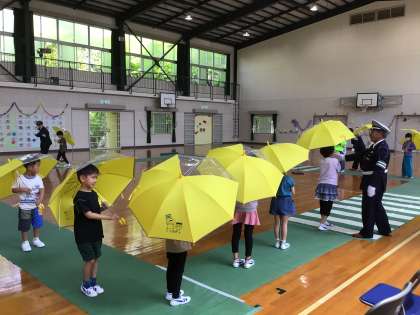 雨降りの日も安全に過ごすことができるように、傘の使い方についても教えていただきました。傘を広げるときには、どんなことをに気をつけるのか、どんなことに気をつけて歩けばいいのかなど、しっかりと学びました。