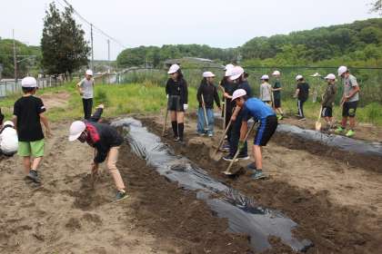 1年生が、今後さつまいもを植えることができるように、5、6年生で協力して、畝作りをしました。校内整備員に助言してもらいながら、鍬や、シャベルを使って溝を掘りました。鍬の使い方や、畝の作り方を体験するよい機会になりました。