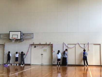 掃除の時間を使って、体育館の飾りの片付けを行いました。先週、「なかよし班(縦割り活動)出会いの会」が大成功に終わり、体育館の掲示物を外すときがきました。てきぱきと手を動かして、手際よく協力して片付けもできました。