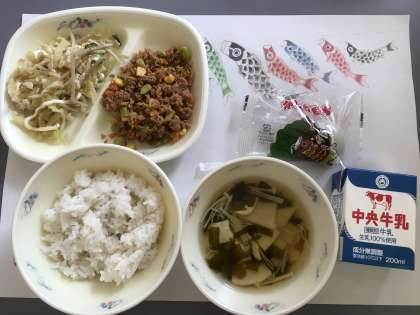 今日の献立は、「かつおのそぼろ丼、牛乳、ごぼうサラダ、若竹汁、かしわもち」のこどもの日献立でした。