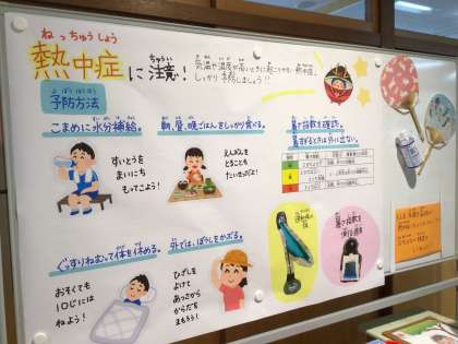 保健室前に熱中症に関する掲示物を掲示しました。