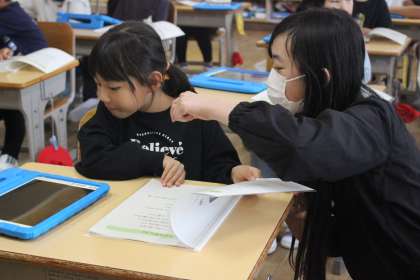 6年生 1年生と学習用タブレットの使い方を確認しました 公開日 2024/05/16 更新日 2024/05/16 各学年から 1年生と学習用タブレットの使い方を確認しました。1年生に使い方を教えながら、6年生自身も、自分のタブレットの使い方について改めて見直す時間となりました。タブレットの使い方だけでなく、日々の生活においても1年生の手本になれるように、学校での過ごし方に気を付けていきます。