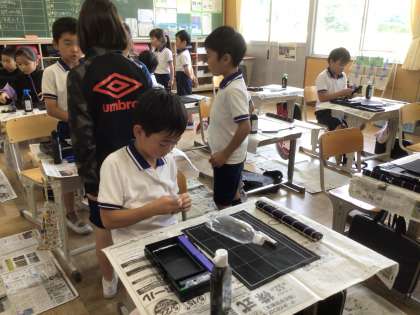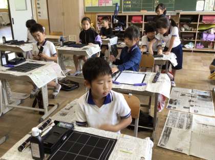 3年生の書写では、今日から習字のセットを使い始めました。今日は、準備や片付けの仕方について話を聞いた後、実際に準備をしました。話を聞いている際や準備をしているときに、分からないことや気になったことを進んで質問することができていました。みんな主体的に習字に取り組もうとしている姿が見られました。片付けも、手早くできていました。次回は、「二」の文字を書きます。みんな書くことを楽しみにしていました。