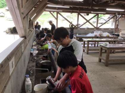 5年生 野外学習 カレー作り片付け 公開日 2024/05/22 更新日 2024/05/22 各学年から 美味しくカレーをいただいた後、食器や鍋、はんごうを片付けています。 ススで真っ黒になった鍋を、「来たときよりも美しく」を合言葉に、ピカピカにしています。