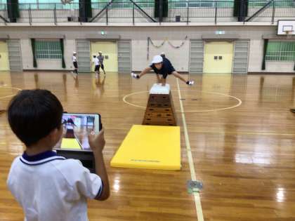 跳び箱では、学習用タブレットを活用して、自分のできているところ、できていないところを分析し合いました。自分自身の目標達成に向けて、一生懸命頑張っています。