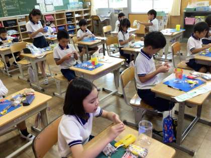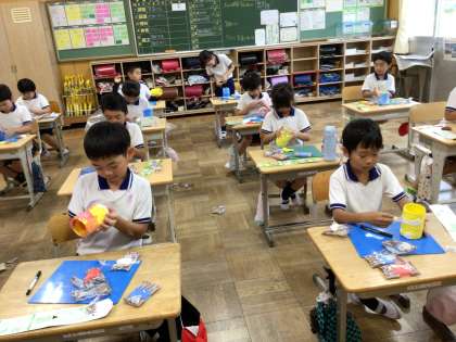 「空きようきのへんしん」の学習では、紙粘土を使ってペン立てを作っています。4色の紙粘土を使い、「赤色と黄色を混ぜたら、オレンジ色になった」などとオリジナルの色を作る子もいました。「富士山を作ろう」「海の世界にしよう」「地球みたい」と想像をふくらませ、みんなで楽しく、集中して取り組むことができました。