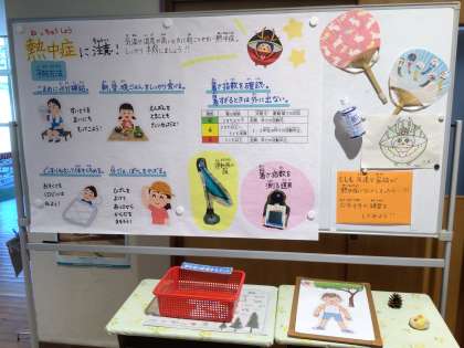 先日の公開日では、小さなお友達が、保健室前にある掲示物で、遊びながら熱中症対策について学んでくれていました。