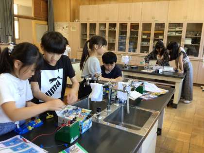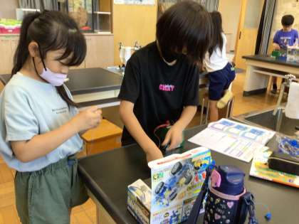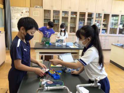 理科の学習で直列つなぎと並列つなぎの電流の大きさを測っています。ペアで苦労しながら回路を作りました。「直列つなぎはモーターがまわるのが早い」「並列つなぎはもっと電流が大きいと思ったけれど、乾電池1個と変わらない」と、実験をしたことで気付きが深まりました。