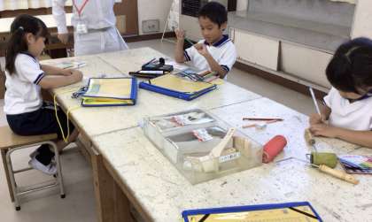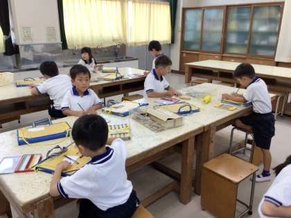 今日は、生活科で図工室の道具を調べに行きました。図工準備室にも入り、教室には置いていない「電動糸のこぎり」「ペンチ」「段ボールカッター」などを見つけ、絵を描きました。図工室で、図工の学習をするのが楽しみになりました。