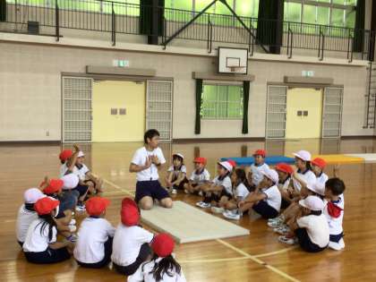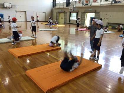 体育館で行う体育科の授業は、マット遊びをしています。けがをしないように、しっかりと準備運動をして、練習を始めます。おへそを見て、首の後ろをマットにつけるようにぐるりと回ります。子どもたちは、とても意欲的に練習をしていました。