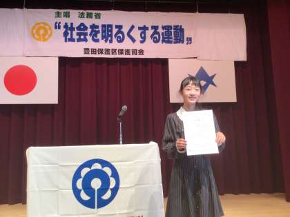 6月16日(土)に「社会を明るくする運動」青少年の意見発表が行われました。本校からは、6年生児童が、学校代表として「勇気を出して挨拶を」と題して発表を行いました。自分から挨拶をするようにしたことで、お互いの心が近付き、仲良くなれたという経験をもとに、挨拶を通した人との関わりの大切さを伝える内容でした。とても堂々と、聴く人の心に響く意見発表をすることができました。