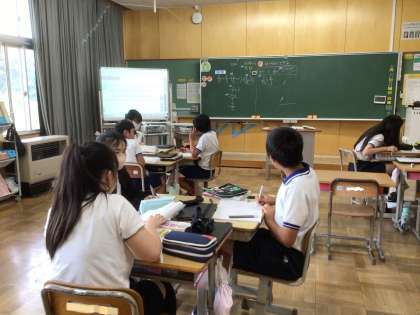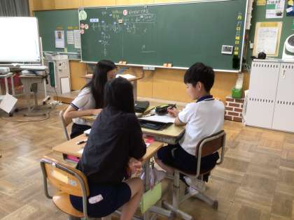 分数を分数でわる計算の仕方を考えました。課題に対して、まずは個々に考え、グループでそれぞれの考えを共有しました。どのように考えたらよいか、お互いの考えを伝え合っていました。その後、学級全体でも伝え合い、分数を分数でわるときには、どのように考えたらよいか、みんなで理解を深めました。学び合いによって、分数同士の四則演算が全てできるようになりました。今後は、応用的な問題にも取り組み、さらに計算力をつけていきます。