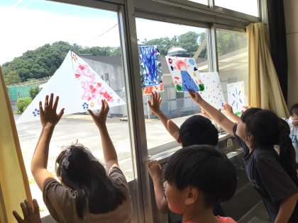 「光のさしこむ絵」の学習では、光を通す材料を組み合わせて、自分の世界を表現しました。窓際で「きれい!!」と、友達と一緒に作品を見合いながら、更にイメージを膨らませていました。出来上がったら、ぜひお家でも飾ってもらいたいです。