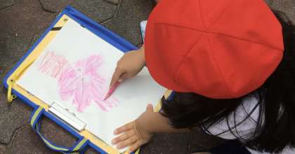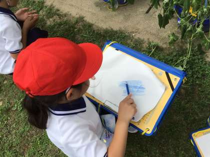 アサガオの葉っぱと遊びました。葉っぱを1枚紙の下に挟み、色鉛筆を使ってこすり出しをしました。色鉛筆の持ち方や角度を工夫することで、みるみるうちにこすり出したアサガオの葉が紙に浮かび上がりました。子どもたちは、その様子を見て、大喜びでした。つるも伸び、アサガオの花が今にも咲きそうな鉢も増えてきました。とても楽しみです。