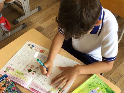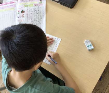 国語科「こんなことしたよ」の学習の発展版として、暑中見舞い葉書をかきました。誰に何を伝えたいのかを考えて学習を進めてきたので、葉書をかくときも受け取る相手の笑顔を想像しながら、楽しそうに取り組んでいました。