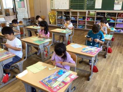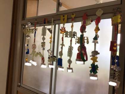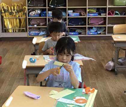 「ちょきちょきかざり」を作りました。はさみの使い方を確認した後で、少しはさみの練習をしました。その後、思い思いの形に色画用紙を切ったり、折り紙を切ったりしました。のりやテープを使って、自分だけの作品を仕上げる子もいました。発想力が豊かで、とても楽しい作品ができあがりました。