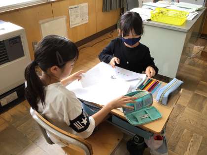 今日は、出し物の準備をしました。休みの間に台本を作ってきたり、みんなに見せる絵を描いたり、それぞれのチームで工夫して頑張っていました。